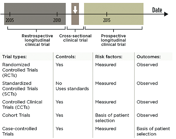 Clinical information is collected in a variety of ways,9 and those differences impact the value of the information. Different biases may be included. Different types of calculations may not be possible. Three major parameters of clinical trial designs involve the “timing,” the “sampling method” of the population, and the nature of the “outcomes” being assessed. A quick summary of all types is presented in Figure 3. A more expansive treatise on types is presented by Spilker.10 A trial may be designed as a longitudinal prospective one (to project into the future), a cross-sectional one, or a longitudinal retrospective one. Longitudinal prospective trials allow for careful planning of all the factors to be controlled and the information to be collected. Retrospective ones are limited to what might have been previously planned in a trial. A cross-sectional trial audits the status or current outcome of patients already treated and generally does not include much information about the variables associated with that treatment. Cross-sectional studies are often different from others, due to the limited qualification of the information being collected. In testing the longevity of dental materials, a cross-sectional trial will often report less than half the value of that of prospective longitudinal trials.11
