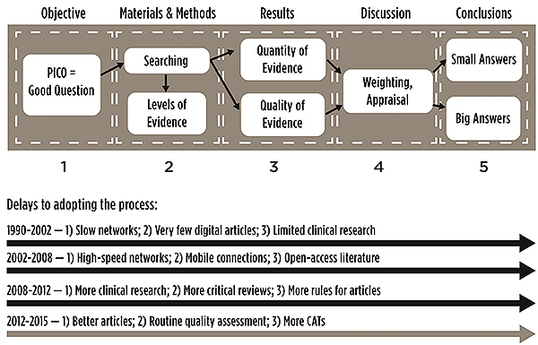 This process has only been initiated in recent years partly because the necessary technologies are just now becoming widely available (Figure 1). Also, there are many tedious steps involved in collecting an answer that are not yet standardized. Collecting evidence is remarkably similar in stages (Figure 1) to all research operations of writing protocols for grants or writing scientific publications—it is “the scientific method.”6 The path includes: 1) asking a clinical question; 2) collecting knowledge in the published literature; 3) assessing the quantity and quality of that information; 4) weighting and/or aggregating the information; and 5) creating a conclusion or answer. Once the answer is available, it can be published in one form or another and used to create new published literature. Often these answers are reported as critical reviews or critical appraisals and collected into evidence libraries. The answers, whether involving small questions or large ones, may not be satisfying if little published information exists. It is much more common for them to be included as part of a summary mentioning that more information or investigation should be done to provide a complete answer.