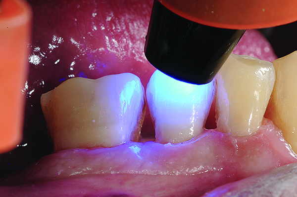 Fig 9 and Fig 10. After GIC was manually condensed and shaped, a nanofilled resin glaze was liberally applied to the surface of the finished restoration (Fig 9) and light-cured (Fig 10).