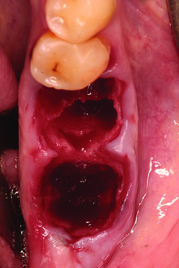 It is well documented that following tooth extraction, reductions in both the alveolar ridge height and width typically occur. The processes of tissue modeling and remodeling have been investigated in both animals2 and humans,3,4 and the routine loss of ridge volume has been explained by the absence of daily stress/strain stimulus required for physiological maintenance of the bone anatomy.5 In the absence of site preservation following tooth extraction, significant tissue-contour loss occurs during the 3 months post-extraction, averaging 3 mm to 5 mm at 6 months.6,7 Horizontal bone resorption of up to 30% lingually and 56% buccally has been reported,8 with overall reduction in ridge width of up to 50% found 1 year after extraction.3