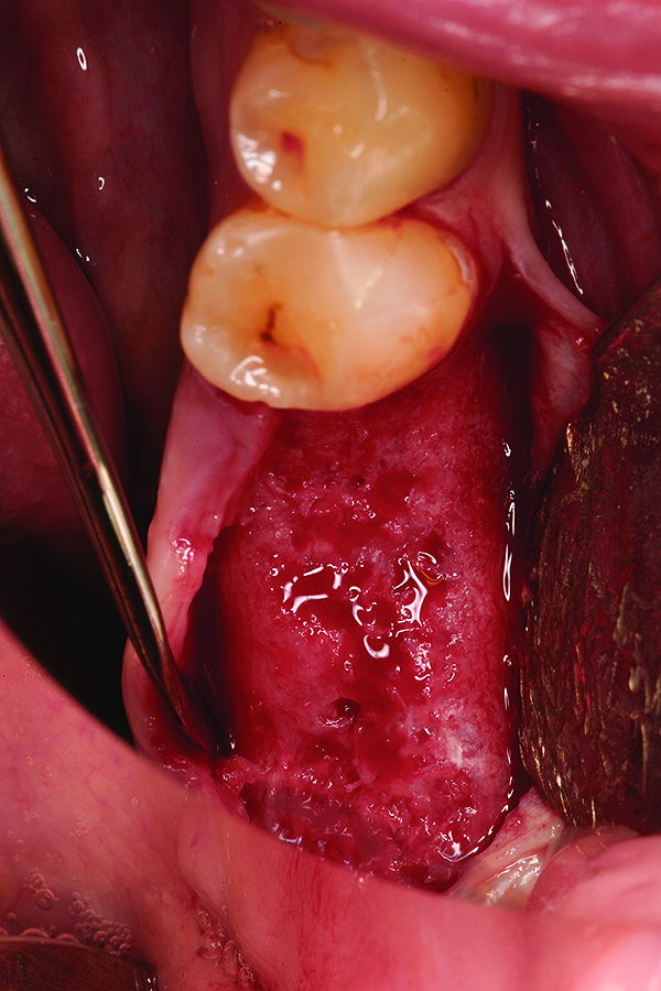 Ten consecutive patients who had sought treatment at a private practice limited to periodontics and dental implants in Austin, Texas, were identified. All patients had required extraction of a tooth with site preservation to facilitate future placement of dental implants. Written and signed informed consent was obtained prior to treatment for all patients. Local anesthesia was obtained using 4% articaine hydrochloride with 1:100,000 epinephrine (Septodont, www.septodontusa.com). In all cases, a full-thickness mucoperiosteal flap was reflected, and tooth removal was accomplished atraumatically. Multi-rooted teeth were sectioned with a high-speed handpiece, while single-rooted teeth were removed with periotome assistance.
