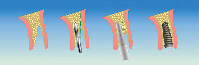 The alternating osteotome technique is indicated in the upper maxillary lateral sectors, where bone Type III and Type IV prevail.16,20 In types III and IV bone, the osteotomes provoke a dislocation compression of the spongious bone toward the sides and upward. At the end of the procedure, a corticalized osseous margin surrounding the implant neosite is obtained.