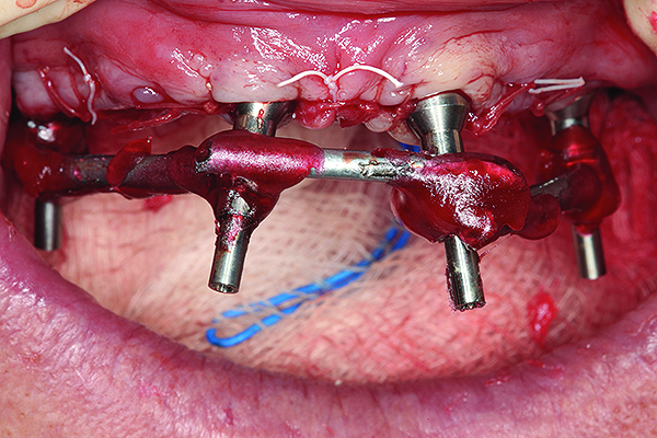 Steps for the provisional prosthetic protocol are as follows: Place open-tray multi-unit impression copings onto the multi-unit abutments, and splint the copings with a low-shrinkage autopolymerizing resin (the authors prefer GC Pattern Resin™ [GC America Inc., www.gcamerica.com]) and wire bars (Figure 5) to improve the accuracy of the impression in order to attain passive fit of the restoration. Then create an open-tray impression with a rigid vinylpolysiloxane (VPS) material to capture the positions of the implants and the soft tissues. This will allow the dental laboratory to construct a provisional all-acrylic resin prosthesis (Figure 6) that can be issued to the patient. An alternate method is to convert the pre-completed new or a well-fitting existing denture by picking up the implants in the mouth and refining the prosthesis extraorally. The provisional prosthesis should be carefully assessed for correct fit, esthetics, and function. If all is correct then the provisional prosthesis is tightened to 15 Ncm. The occlusion then is carefully adjusted so that there are contacts only in the intercanine region and no premature contacts posteriorly.11,12 At this point, the patient is given strict instructions on oral hygiene with a chlorhexidine mouthwash as well as a soft diet protocol for a period of 6 weeks to minimize micromotion.