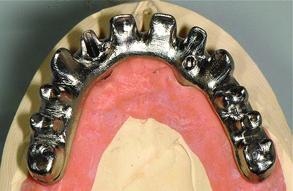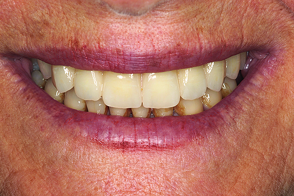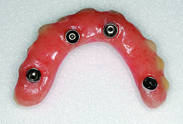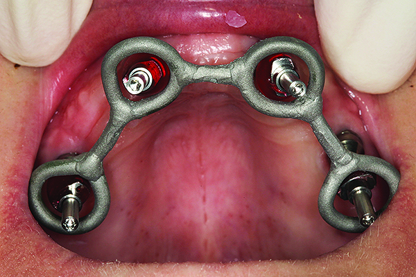 The final restorative solution can be either fixed or removable. Fixed solutions may include: computer-aided designed/computer-aided manufactured (CAD/CAM) fixed prostheses with a titanium (Figure 8 and Figure 9) or zirconia (Figure 10 and Figure 11) framework; fixed prostheses with a CAD/CAM-designed titanium or zirconia framework with acrylic veneering (Figure 12); or fixed prostheses with cast metal and veneering porcelain. Removable solutions may include a milled bar overdenture with attachments, such as locators or an MK1 Attachment (MK1 Dental Attachment GMBH, www.MK1.de) (Figure 13). Removable solutions that allow for simpler hygiene-related practices may be beneficial for elderly patients. In addition, removable solutions may be necessary for patients who require sufficient lip support, as the flange on a removable solution can assist in supporting the contours of the face. It is important to discuss the relative advantages and disadvantages of fixed and removable solutions during the informed consent process.
