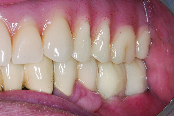 After an occlusal load is applied, the periodontal ligament (PDL) fibers return a free-standing tooth back to its original position. Teeth connected to implants with semi-precision attachments or telescoping crowns are at risk of intrusion (Figure 4). Friction prevents the natural rebounding ability of a tooth provided by the PDL fibers. In such cases, the path of draw of the attachment does not line up with all of the PDL fibers, and they, therefore, are not able to bring the tooth back into occlusion. As a result, the PDL fibers become continuously stretched. Once the tube attachment is removed and, with it, the source of friction, the tooth will become free to move on its own and will subsequently erupt spontaneously into occlusion (Figure 5). The periodontal attachment apparatus will not follow the erupting tooth, resulting in recession. Under normal circumstances a healthy attachment apparatus will move with the extruding tooth.7,8