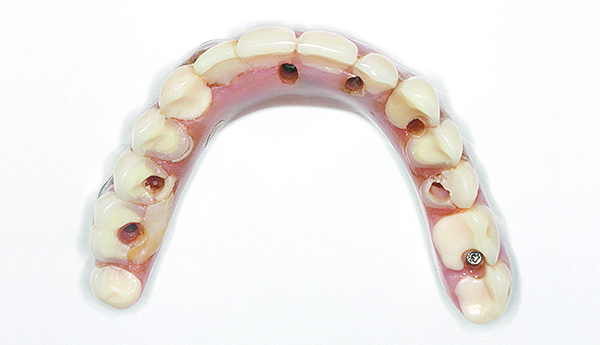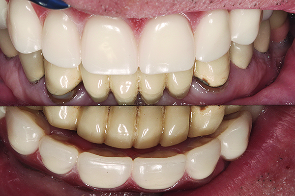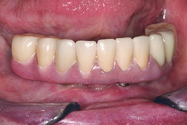 The benefits of cross-arch stabilization have been described above. The drawback of any one-piece design is the difficulty in repairing any such restoration. This can be avoided by having a full-arch framework that supports removable screw-retained PFM segments (Figure 13 and Figure 14) or individually CAD/CAM-milled cemented crowns (Figure 15 through Figure 18). This combines the strengths of a one-piece restoration with easier maintenance.