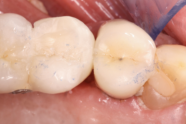 A single tooth between two implants is vulnerable to friction as well. If the contacts are too tight the tooth cannot rebound from occlusal and horizontal forces. The PDL fibers can be stretched and the attachment apparatus damaged just like in the previous example. The contact pressure needs to be adjusted until shimstock foil can be pulled out with only slight resistance or drag (Figure 6). The adjustment is complete when the tooth is able to rebound on its own when pushed facially or lingually. The contact relationship can change and open up if the tooth were to erupt and change position in the future. A nightguard or retainer can help prevent those changes from occurring.