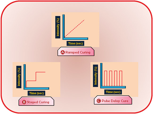One method to reduce polymerization shrinkage-associated stresses and microleakage is by providing an initial low rate of polymerization.5 This may reduce the stress buildup by supplying extended time for stress relaxation before reaching the gel phase. This can be accomplished by using a soft-start curing technique in which the curing begins with a low intensity and finishes with a high intensity.49 This causes the maximal possible conversion to occur only after much of the stress has been relieved. Various light-curing units automatically provide one or more soft-start exposure sequences. Some produce a 100 mW/cm2 output for 10 secs, followed by an immediate increase to 600 mW/cm2 output for 30 secs. Soft-start polymerization is divided into three techniques: stepped, ramped, and pulse-delay2 (Figure 1).