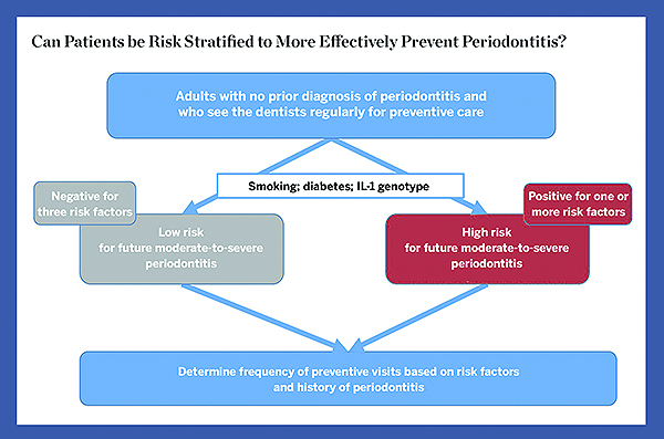 In a risk-based approach to assess tooth-loss events associated with preventive visits, Giannobile and colleagues16 classified patients based on their risk factors to determine the relationship between risk and preventive care visits. Patients were classified as high risk for progressive periodontitis if they presented with one or more of three risk factors (ie, smoking, diabetes, interleukin-1 genotype); or low risk if they presented with none of these risk factors. It was found that low-risk patients experienced tooth loss event rates of 14% to 16% over a 16-year period, which did not differ significantly among patients who consistently had two or one annual preventive visit(s), respectively; however, high-risk patients had higher tooth loss rates (17% to 22%) over the 16-year period and benefited significantly from two preventive visits annually. The researchers concluded that a personalized medicine approach combining gene biomarkers with conventional risk factors to stratify populations for preventive dentistry may provide enhanced approaches for prevention of severe periodontitis (Figure 2).16