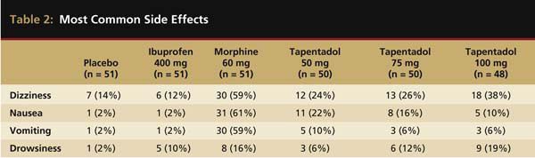 Most common side effects in the placebo, ibuprofen 400 mg, morphine 60 mg, and tapentadol 50 mg, 75 mg, and 100 mg groups. Table adapted from Kleinert R et al. Anesth Analg. 2008;107(6):2048-2055.