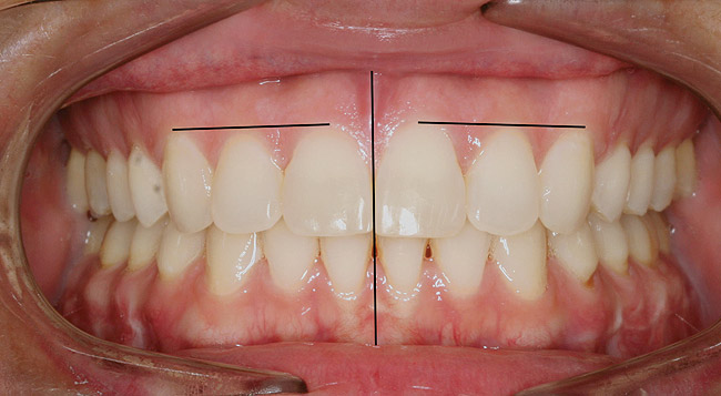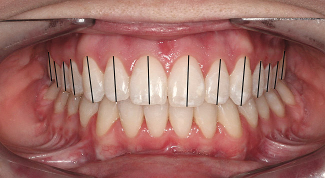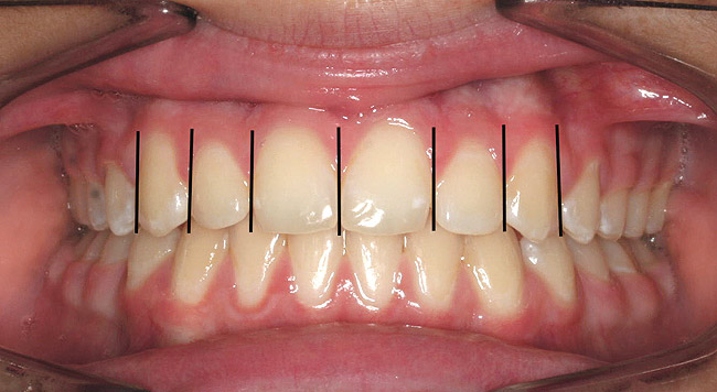 Gingival heights and zeniths are important for establishing balance in dental esthetics. In the esthetic dentition, the gingival height of the lateral incisor should range between even with a line between the central incisor and canine to as much as 1.5 mm incisal to that line. The relative size of the lateral should be a guide as to where it should be positioned. The zenith of the gingival margin for maxillary central incisors and canines should be just distal to the tooth midline, while the zenith of the maxillary lateral incisor is at the midline (Figure 5).7,8 While the restorative dentist or periodontist can modify these components of gingival balance, the orthodontist should routinely ensure that these objectives are in place.