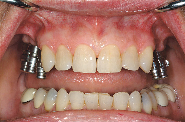 When dental implants were introduced by Brånemark, they were intended primarily for the completely edentulous patient, specifically the edentulous mandible. The initial prosthesis was a fixed restoration commonly referred to as a fixed bone anchored bridge. That particular prosthetic design is now the fixed-detachable hybrid prosthesis and has been highly successful for both the implants and prostheses.12,13 Implants have also been used for overdenture restorations14 and can be implant-assisted or implant-supported. With implant-assisted prostheses, the implants and mucoperiosteum share the forces of occlusion. A simple two-implant overdenture, either a Hader Bar® (Sterngold™, Attleboro, MA) or Locator® abutment (Zest Anchors, Escondido, CA), are examples of implant-assisted overlay prostheses and are always a removable restoration (Figure 4 and Figure 5). With implant-supported prostheses, the forces of occlusion are borne solely by the implants. This prosthesis can be an overlay prosthesis or a fixed restoration. Milled bar restorations, overdentures with bar substructures, and metal ceramic restorations attached to implant abutments by either screws or cement are examples of implant-supported restorations. One of the primary benefits of using dental implants in edentulous patients is the preservation of the residual bone, which will provide a better opportunity for future successful prosthetic restorations.
