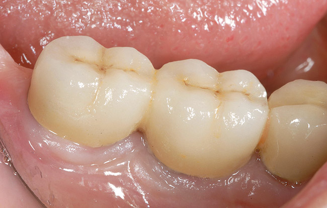 Other factors may play a role in the final esthetic outcome. Indexing the position of the implant at the time of placement, use of provisional restorations, and customized impression copings to record gingival contours for laboratory fabrication of the abutment and crown are examples of techniques to enhance the overall esthetic result (Figure 13 through Figure 16). In addition, newer materials have been introduced to aid the fabrication of esthetic abutments and restorations placed on dental implants. Zirconium, both as an abutment and restoration, has been shown to have a beneficial esthetic effect and is well tolerated by the surrounding tissue.28 Caution, though, must be emphasized in the use of this material because it is not fully known how it will withstand functional loads long term, especially in the posterior areas. Titanium abutments remain the material of choice in the posterior areas.29 Waxing and casting of premachined UCLA-type abutments also offers an option for abutment design, enabling precise angle corrections when necessary, although the rise in the cost of precious metals may limit the use of this material in the future. The significant improvement of abutments generated with computer-aided design and computer-aided manufacturing (CAD/CAM) has greatly enhanced the abutment design and fabrication. Metal ceramic restorations provide suitable restorations in the posterior region and are used because of their proven long-term success,1-3 although proper metal coping design is necessary for strength of the veneered porcelain. Gold occlusal surfaces, especially in the molar region, may be the best choice if the patient has high occlusal forces or parafunctional habits that may make material fracture a concern.