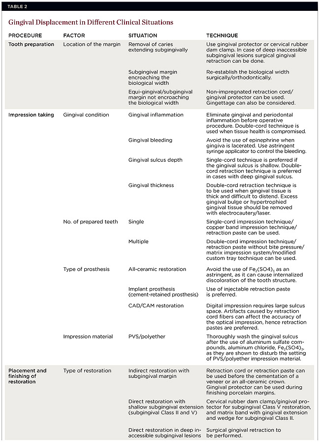 The techniques of gingival tissue displacement can be broadly classified as nonsurgical and surgical methods (Table 1). Since surgical methods are usually effective in skilled hands, these techniques are used only by a minority of clinicians in their profession, and even then they are used only as adjuncts to mechanical or mechano-chemical means of gingival displacement. Therefore, the purpose of this article is to describe the different means by which nonsurgical gingival displacement can be achieved effectively under a variety of clinical situations (Table 2).