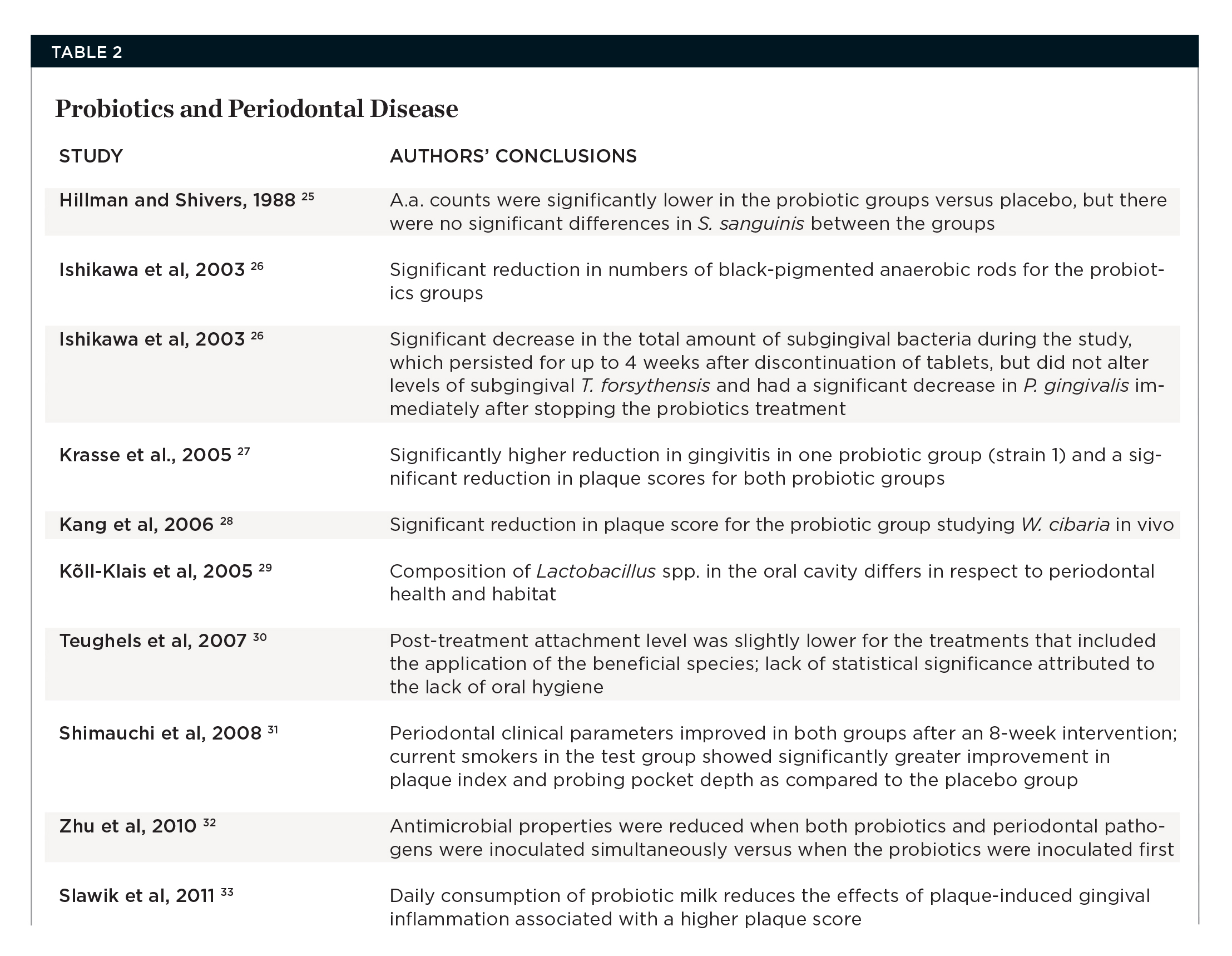 Periodontal disease requires a susceptible host, pathogenic species, and a reduction or absence of “beneficial bacteria.” Probiotics might work by suppressing the endogenous pathogens or preventing the superinfection by exogenous pathogens and/or promoting a beneficial host response.23 In their review, Teughels et al24 summarized studies that were relevant. Hillman and Shivers25 studied gnotobiotic rats with an artificial oral Aggregatibacter actinomycetemcomitans (A.a.) infection in a parallel, open-label, placebo-controlled study and found that A.a. counts were significantly lower in the probiotic groups versus placebo, but there was no significant difference in the Streptococcus sanguinis—either the parent strain, hydrogen peroxide deficient mutant, or revertant of the mutant—between the groups. They had already identified that S. sanguinis and Streptococcus uberis could inhibit the growth of periodontopathogens. This was based on the production of hydrogen peroxide. However, because colonization of A.a. also decreased with the mutants, other mechanisms beside hydrogen peroxide must also be playing a role.