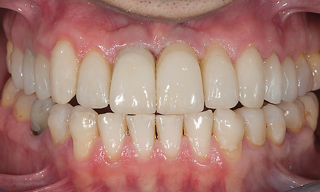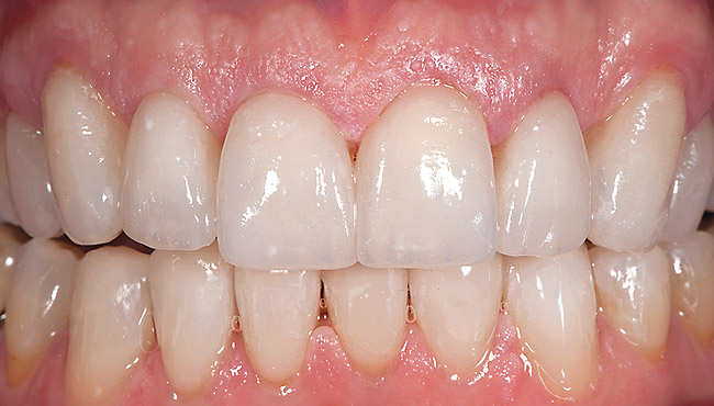 Bonded pure porcelain restorations are ideal as the most conservative choice but are the weakest materials and require specific clinical parameters to be successful.13 Many good materials and techniques are available for bonded porcelain (eg, Creation, Jensen Dental, www.jensendental.com; Cermaco® 3, Dentsply, www.dentsply.com; EX-3, Noritake, www.noritake-dental.co.jp). The authors use Vita® VM 13 (Vita Zahnfabrik, www.vita-zahnfabrik.com) when 3-D master shades are taken and Halo (Shofu, www.shofu.com) when classic shades are taken. When following clinical parameters and guidelines at the UCLA Center for Esthetic Dentistry, the authors have observed similar success rates with these materials when compared with porcelain-fused-to-metal (PFM) materials (ie, less than a 1% fracture rate if all parameters are followed) (Figure 5 and Figure 6).