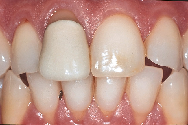 Mostly all-crystalline materials (eg, In-Ceram®, Vita) are used for core systems to replace metal that would then be veneered with porcelain. Alumina-based systems, eg, In-Ceram, Procera® (Nobel Biocare, www.nobelbiocare.com), were first on the market but are now generally being replaced with zirconia systems. Alumina systems have been shown to be very clinically successful for single units, with a slightly increased risk in the molar region.15,16 They can be recommended for any single-unit anterior or bicuspid crown (Figure 13 and Figure 14). The authors have observed a slight increase in failure with conventional cements. For example, after using alumina restorations for many years at the UCLA Center for Esthetic Dentistry, the authors observed that at between 8 and 10 years, the failure rate doubled to approximately 2%, with those failures being core fractures necessitating replacement. Their suggestion for alumina core restorations is either a resin-modified glass-ionomer luting cement (eg, Fuji PLUS™ GC America, www.gcamerica.com; RelyX™ Luting, 3M ESPE, www.3mespe.com) or a resin cement. For zirconia core systems (eg, Vita YZ, Vident, www.vident.com; Procera® Zirconia, Nobel Biocare, www.nobelbiocare.com; Lava™, 3M ESPE), the authors have not experienced core fracture but have seen problems with chipping of porcelain. White and McLaren17 found that a special slow-cool thermal cycle minimizes the stress in the porcelain and porcelain/zirconia interface. Clinically, because the authors of this current article have been using the altered firing schedules, their replacement rate for chipping has been reduced by less than 1%.