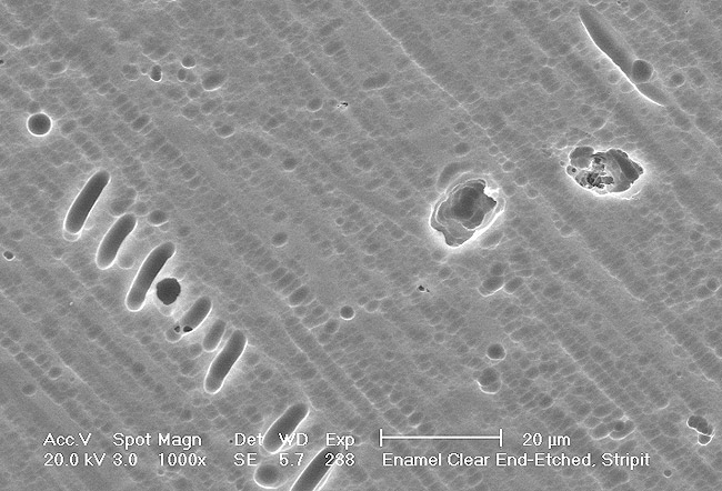 Mechanical properties are low, with flexural strength usually from 60 MPa to 70 MPa. Thus, they tend to be employed as veneer materials for metal or ceramic substructures, as well as for veneers, using either a refractory die technique or platinum foil. The microstructure of a glass is shown in Figure 1. This is an electron micrograph of an acid-etched glass surface. The holes indicate a second glass, which was removed by the acid. The veneer restoration uses a glassy porcelain (Figure 2A and Figure 2B).
