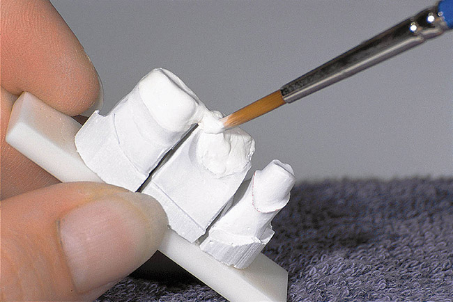 In-Ceram powder dispersions used in the slip-casting technique have been applied to electrodeposition systems, which apply a current across the dispersion and deposit the powder particles automatically on the surface of a conductive die. This approach is efficient for single units but becomes cumbersome and potentially unreliable for multiple-unit frameworks.