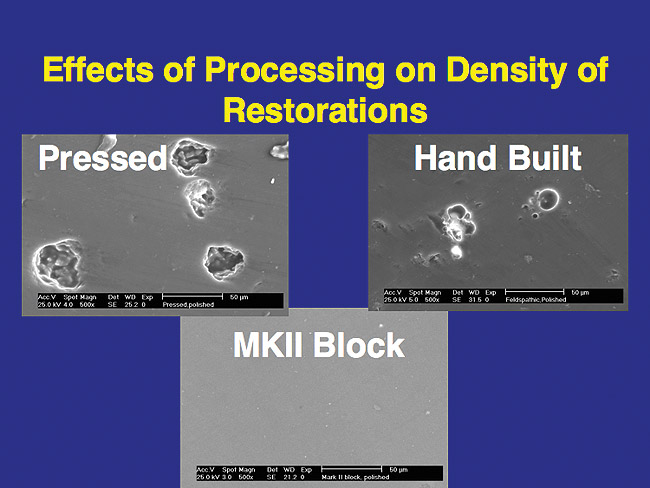 These are typically veneer materials, which may be all glass or a mixture of glass and crystal components. These include veneers for all-ceramic and metal frameworks and may also be used alone as anterior veneer restorations. Typically, these materials are hand-mixed with de-ionized water or a special modeling liquid supplied by the manufacturer. They are built up by hand and vibrated (condensed) to remove water and air. These are fired in a vacuum to help remove remaining air and improve the density and esthetics of the veneer. Because these restorations are handmade, voids are often present in the fired material. This is inherent to the process and may be better or worse depending on environmental conditions, the technician’s skill, and the firing cycle. Frequently, one sees bubbles remaining in the hand-layered veneer material.