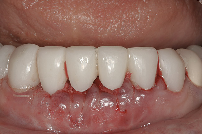 The periodontist and restorative dentist agreed, with the caveats that there would likely be a greater resulting gingival margin height on No. 23 relative to those of the adjacent implant crowns, and a flatter interproximal papillary architecture, which she accepted. She also found the resin partial denture increasingly difficult to tolerate and thus accepted the more comfortable and esthetic alternative proposed by the restorative dentist, ie, a fixed provisional covering the entire mandibular anterior segment. This also accommodated her esthetic needs and the planned full coverage on teeth Nos. 22, 23, 27, and 28.