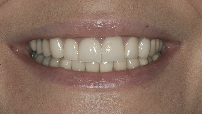 The patient, who works as a professional model, was pleased with her esthetic result, which was a paramount criterion for the team approach applied to this case, as emphasized by Vermylen et al, who reported positive to very positive ratings on esthetics and phonetics among 48 patients with 52 implants on which crowns were fabricated by their restorative dentists.12