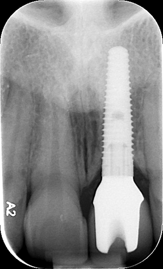 A resin-based removable partial denture fabricated by the restorative dentist to replace No. 26 was delivered and adjusted by the periodontist. After further consultation, the patient approved removal of teeth Nos. 24 and 25 to reduce the risk of implant complications (ie, infection) from adjacent questionable endodontically treated teeth. However, based largely upon patient input, the somewhat unconventional decision was made to keep No. 23; because it was healthy, she wished to retain it and replace the remaining three incisors instead of replacing all four with two implants and a 4-unit bridge.