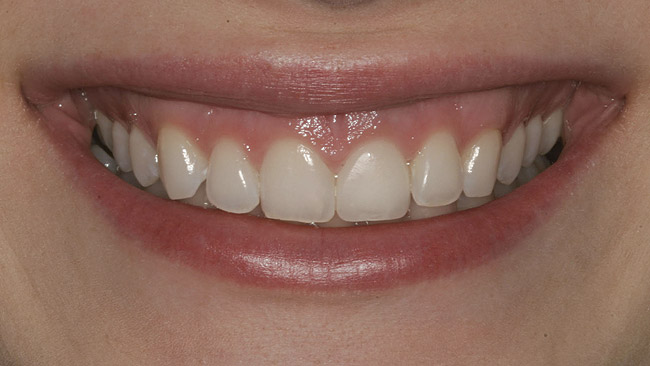 This patient faced a unique situation, perhaps not previously reported: retaining a healthy mandibular lateral incisor knowing this would create an esthetic compromise. Indeed, while the discrepancy in gingival-margin height is noticeable in retracted view (Figure 7), it does not show in full smile (Figure 8).