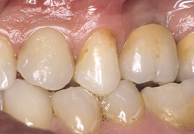 Figure 2 Preoperative view of the area around tooth No. 24. On the left, a previously placed implant abutment is visible. |