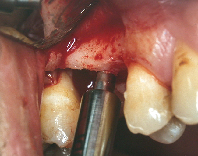 A 45-year-old female was referred for implant placement and prosthetic treatment in the area of tooth No. 24. The tooth had been extracted 4 years prior; the patient did not wear any denture thereafter. The radiograph revealed adequate bone height and a 5-mm to 6-mm ridge at the crest (Figure 2). It was decided to place a 11.5 mm in length, 3.75 mm in diameter Tapered Screw-Vent® implant (Zimmer Dental, www.zimmerdental.com) using the alveolar remodeling technique in the area of tooth No. 24.