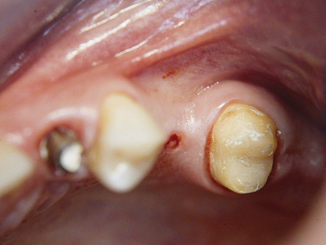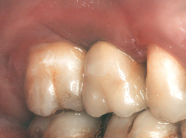 Figure 2 Preoperative view of the area around tooth No. 24. On the left, a previously placed implant abutment is visible. |
