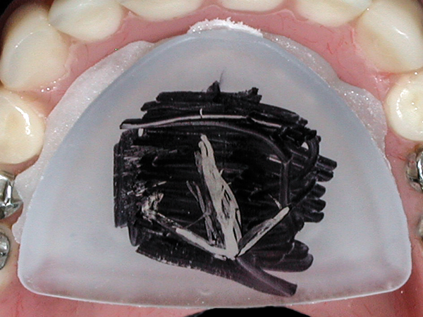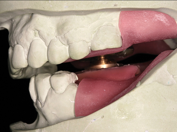 The maxillary posterior teeth are lubricated with a lubricant (eg, Reline Screen, LeeMark Dental, www.leemarkdental.com). Autopolymerizing tooth-colored acrylic resin (eg, Jet Acrylic, Lang Dental Manufacturing Co., www.langdental.com) is mixed, and the “doughy” resin is placed over the mandibular posterior teeth. While the acrylic is in a doughy consistency, the patient is instructed to perform all the mandibular movements (keeping contact of the pin with the striking plate at the predetermined OVD). This movement is continued until the initial set of the acrylic. The splint is removed from the mouth and then placed in a pressure pot (eg, Polyclav®, Dentaurum, www.dentaurum.de) containing warm water for 20 minutes and is pressurized at 25 psi. Next, laboratory rotary instruments are used to trim excess acrylic. The patient is instructed to wear the splint until stable maxilla-mandibular relationship can be recorded. The splint will help deprogram the muscle and also enable the patient to get accustomed to the new OVD.