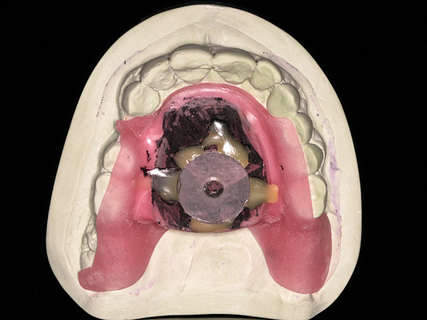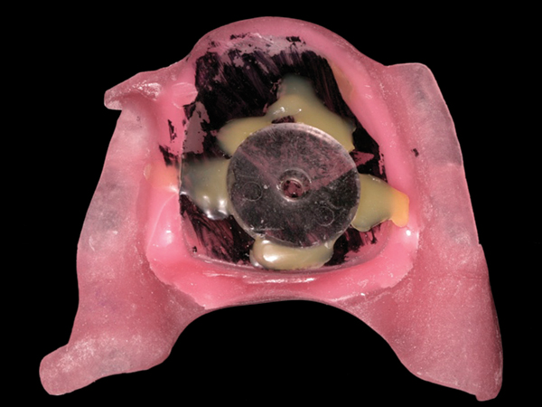Fig 11. Maxillary acrylic appliance record base with striking plate mounted with an ink solution to identify centric relation or RCP.