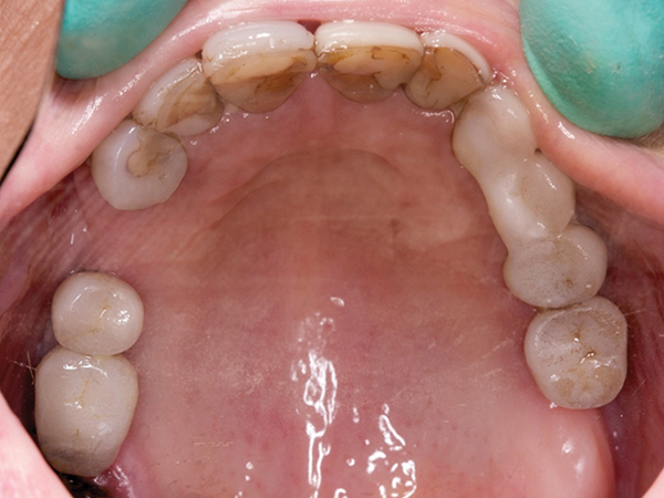 Fig 6. Maxillary dentition showing deteriorating restorations and decay.