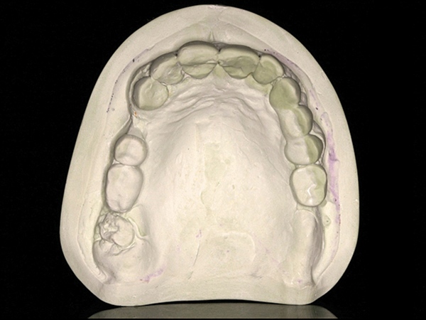 Fig 7. Definitive maxillary cast utilizing thermoplastic heat shapeable tray; the use of VPS shows detailed vestibular areas and tooth structures.