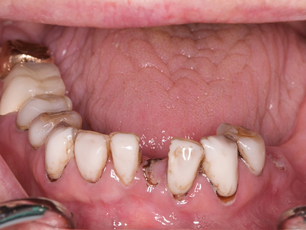 Fig 8. Mandibular restorations reveal decay; fractured teeth Nos. 20 and 24 are nonrestorable.