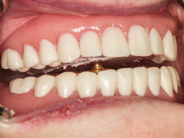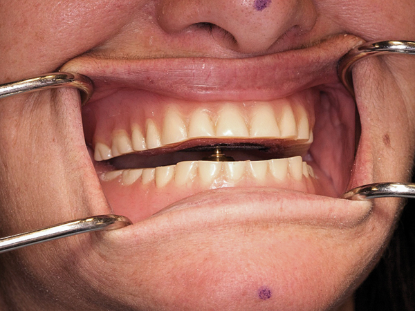 Balance of complete dentures, removable partial dentures, and implant overdentures (Figure 17) is another application. One of the most difficult procedures in removable prosthodontics is finely equilibrating the occlusion of the finished prosthesis. Intraorally, the prosthesis moves with every occlusal prematurity, producing erroneous marks on the articulating paper. Extraoral remounts are time-consuming and often incorporate inaccuracies, due to the remount procedure itself. The jaw relation recording device eliminates these problems.16
