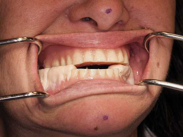 The next application for the jaw relation recording device is for establishing OVD and recording RCP in patients needing full-mouth rehabilitation and immediate dentures. The procedure is the same as described in Clinical Application 1. Most of these patients are overclosed due to excessive tooth wear and need an increase in OVD for optimal restoration of function and esthetics. RCP records have to be made at the restored OVD. This can be most accurately achieved using the jaw relation recording device. Also, this method increases the reliability of the record by not allowing any tooth contact, which may deflect mandibular movements.