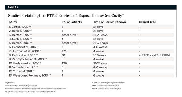 When the efficacy of d-PFTE was compared to e-PTFE to achieve GTR in osseous defects, the studies demonstrated there were no statistically significant differences with respect to gaining bone.19-21 In these three clinical trials the barriers were submerged, and alloplastic bone20,21 or a xenograft was used.19 Barriers were left in place 6 to 8 weeks. No studies compared the regenerative efficacy of submerged versus exposed barriers.