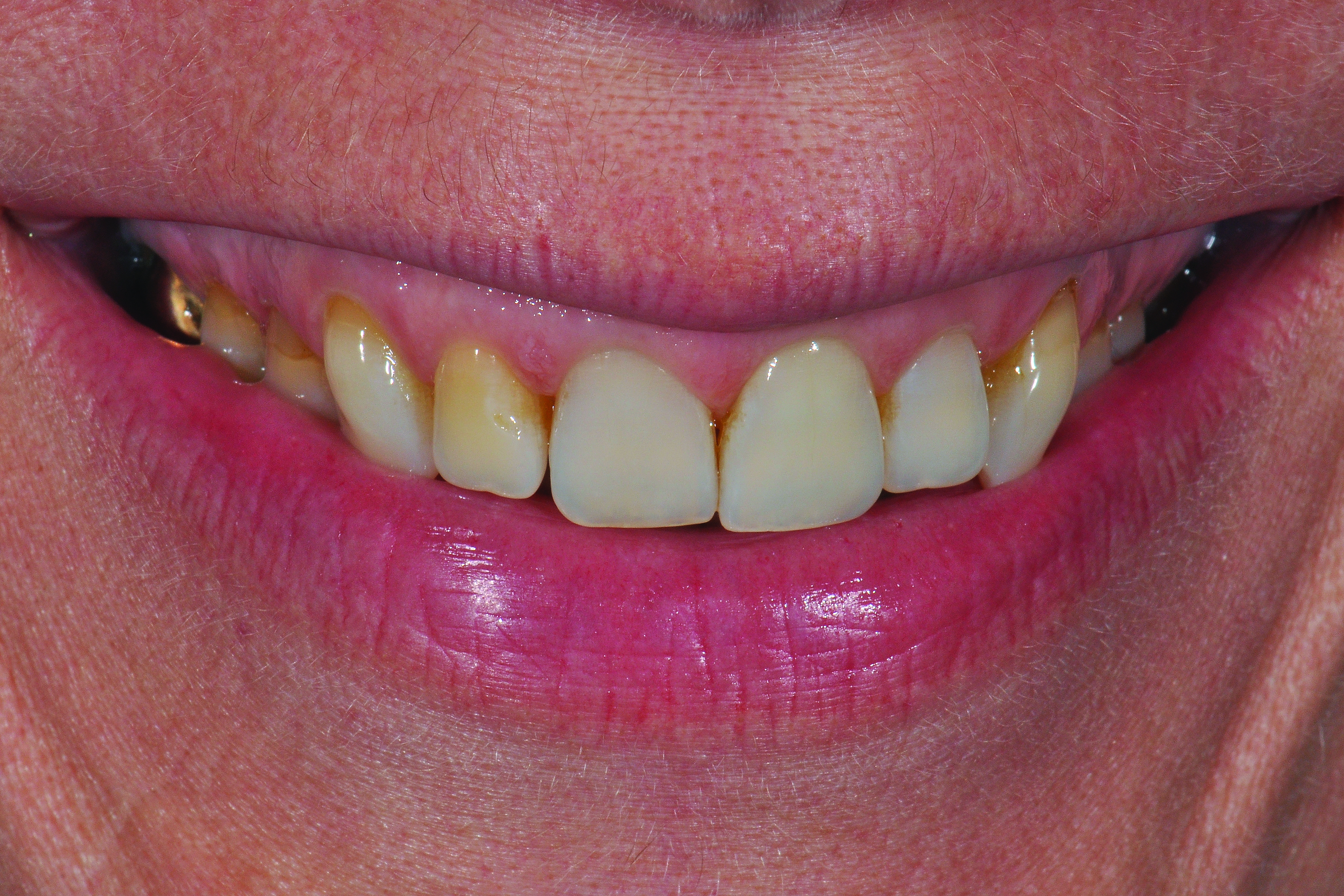After consultation with the patient regarding these findings, an implant strategy was chosen. The patient was made aware of several esthetic challenges related to her case, including a high smile line (Figure 4), ankylosis of the tooth to be extracted, and long-term maintenance of the alveolar process and associated mucosal topography post-extraction due to a very thin facial cortex of bone labial to tooth No. 8.