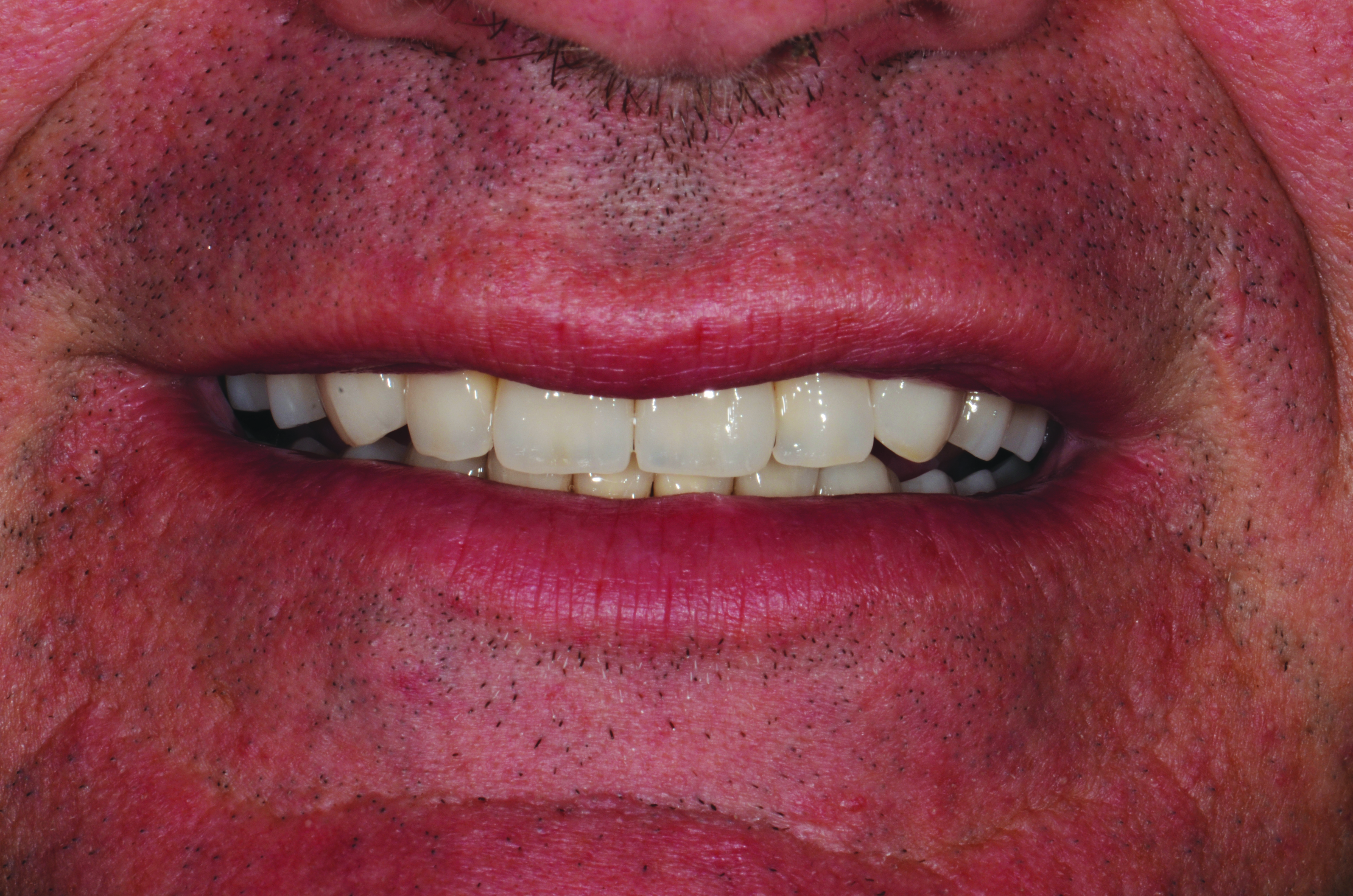 As with all restorative materials, the evolution of zirconia products has produced great esthetic results. Although the use of zirconia for esthetic cases was limited in the past, today’s zirconia structures and layering ceramics are becoming the esthetic choice for a large portion of the restorations fabricated in the laboratory. Zirconia abutments were fabricated on titanium sleeves, and zirconia copings were fabricated with a translucent material. The ceramic layering was completed (Figure 13 through Figure 16), and the final restorations were permanently cemented. A 2-year follow-up showed the patient’s esthetic and functional concerns were met while the occlusal adjustments protected the restorations based on the new functional position (Figure 17 through Figure 21).