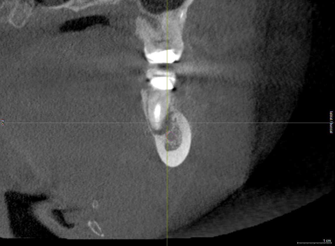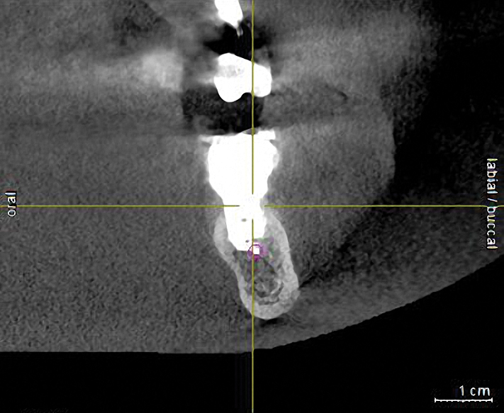 Subsequent to nerve injury, the clinician needs to determine if immediate referral is necessary or a pharmacologic approach is warranted or if implant removal or reverse-torquing it a little would best serve a patient. There are diverse opinions in the literature pertaining to when and under what conditions referral to a microsurgeon is needed.58,59 It is generally agreed that if a clinician believes that a nerve has been transected as a result of an implant procedure, immediate referral is warranted.12,51,54,60,61 On the other hand, if a patient manifests neurologic symptoms post-implantation, but the clinician is sure that the drill never entered the mandibular canal, it is possible that postoperative altered sensation is caused by traction of a nerve or an inflammatory process. Then a pharmacologic approach may be warranted.3 A clinician can be almost sure that the drill did not enter the mandibular or mental canal if after each drill, the floor of the osteotomy was checked with an implant probe or if a radiograph clearly depicts the osteotomy terminated several millimeters from the nerve canal. The previous remark is qualified, because there is the remote possibility that some unusual branch of the IAN was present and damaged. From another perspective, a CBCT scan can be ordered to attain an enhanced view of the implant’s relationship to vital structures if a 2-dimensional radiograph was initially used to assess the situation (Figure 1 and Figure 2).