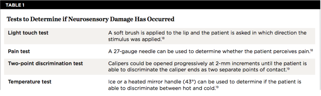 Injuries to the trigeminal nerve can include compression, stretching, and partial or complete transection. Damage can result in neurosensory alterations with respect to touch, pressure, temperature, and pain.7 Trigeminal nerve malfunctions can interfere with speaking, eating, kissing, shaving, applying makeup, toothbrushing, and drinking.7 In addition, these injuries can have psychological effects and affect social interactions.8 Altered sensations (eg, pain) may be detected during surgical manipulations or there may be a delayed onset of discomfort.