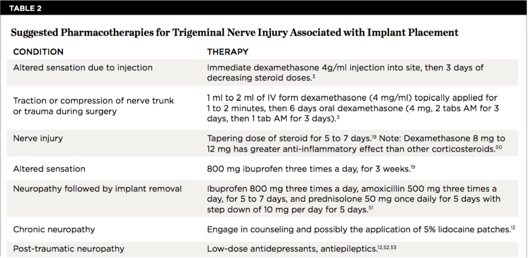 There is no consensus with respect to use of pharmaceuticals after a nerve injury. However, some authors suggest the use of corticosteroids and nonsteroidal anti-inflammatory drugs (NSAIDs).3,12,16,19,50-53 Pharmaceuticals may be appropriate when signs or symptoms of neurosensory alterations occur and the clinician is certain that the nerve was not transected.