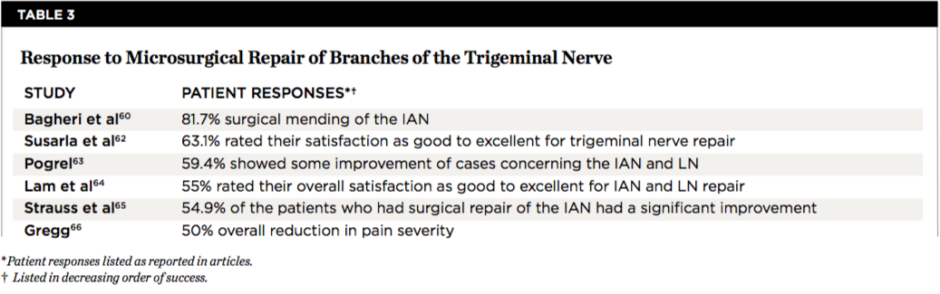 Microsurgical repair of injured branches of the trigeminal nerve (IAN and LN) can be accomplished.62 However, the successful repair rate and amount of sensory restoration are variable (Table 3).60,62-66 Furthermore, it should be noted that most of the cited studies had limited populations and the final assessment methods were different; therefore it is not possible to directly compare the success rates of these studies.