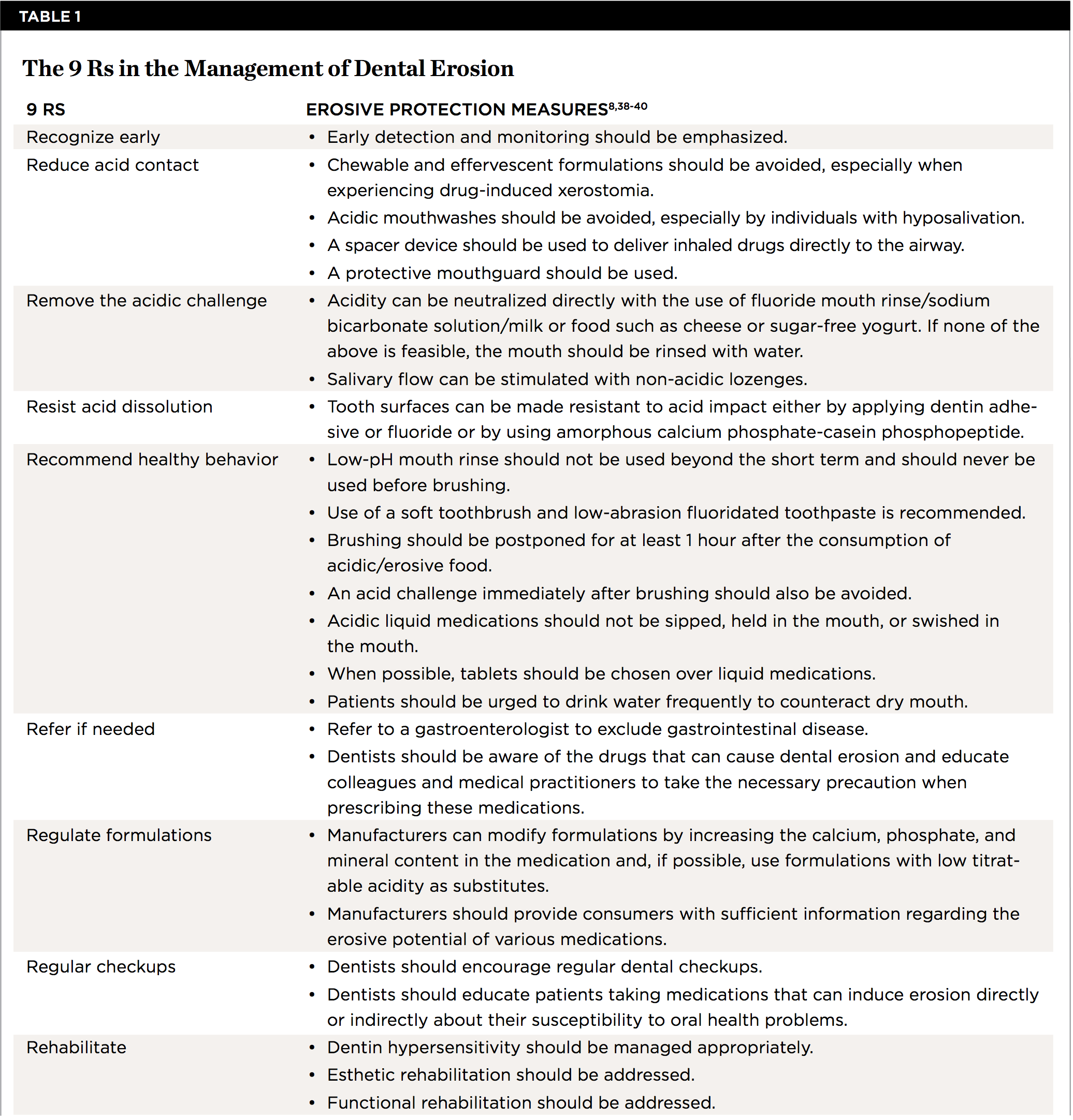 Various measures to prevent and reduce the incidence of dental erosion related to medications have been summarized in Table 1 as The 9 Rs in the management of dental erosion.