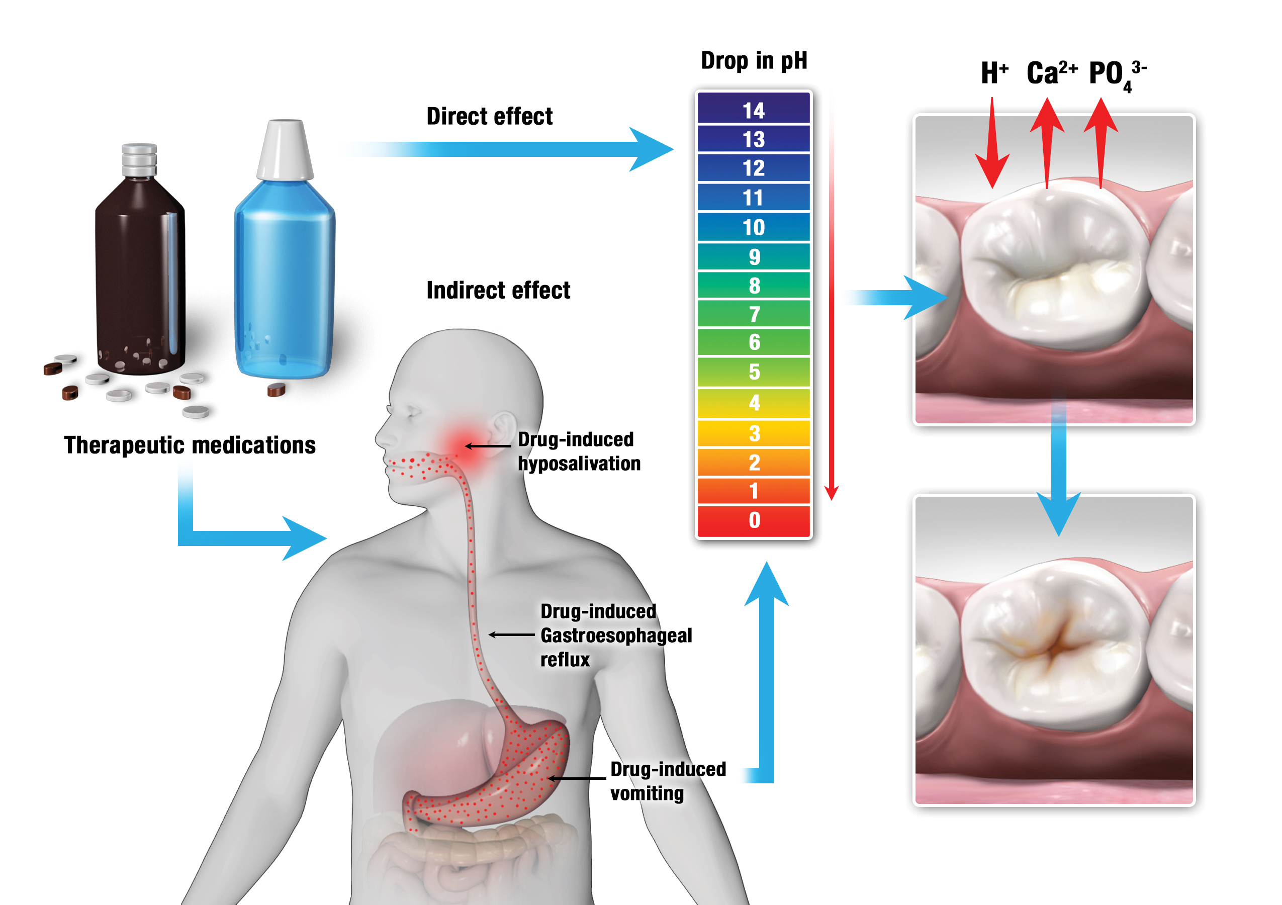 Sources of the acid that lead to tooth erosion can be either intrinsic (acid content from within the body) or extrinsic (from an external acid source).5,8 One source of acid that is often overlooked is that of the various medications prescribed by doctors. Some medications cause dental erosion directly, as a result of their acidity or chelating action,9 while others cause erosion of the dental hard tissue secondary to their side effects (Figure 2).10 Therefore, oral healthcare providers should educate patients and colleagues about the drugs that can cause dental erosion, either directly or indirectly.