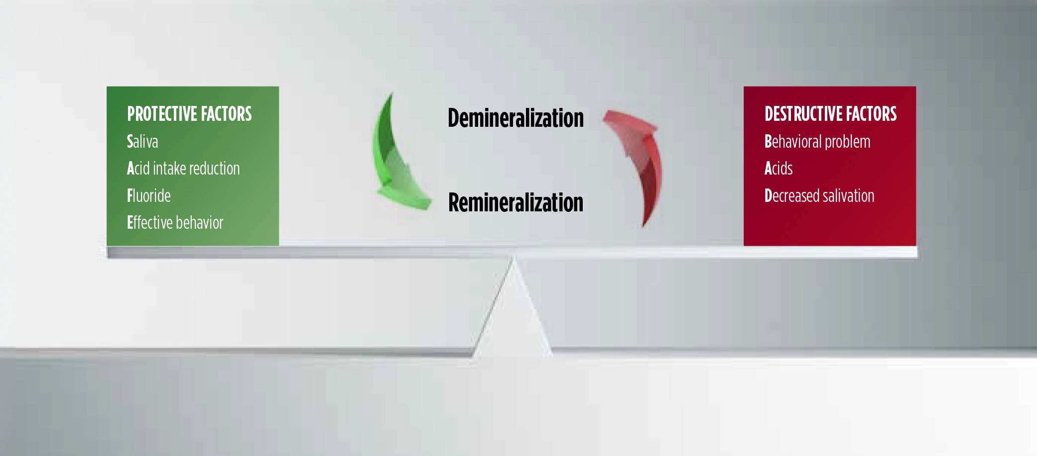 The surfaces of teeth are in a state of dynamic ion exchange in order to maintain equilibrium between demineralization and remineralization.1 On one side are factors that disrupt this balance, including acids and unhealthy habits (such as cola swishing and fruit mulling), and on the other side are factors that protect tooth-surface integrity such as fluoride and good quantity and quality of saliva (Figure 1).2,3 A change in this equilibrium toward the destructive factors can result in tooth-surface loss.4