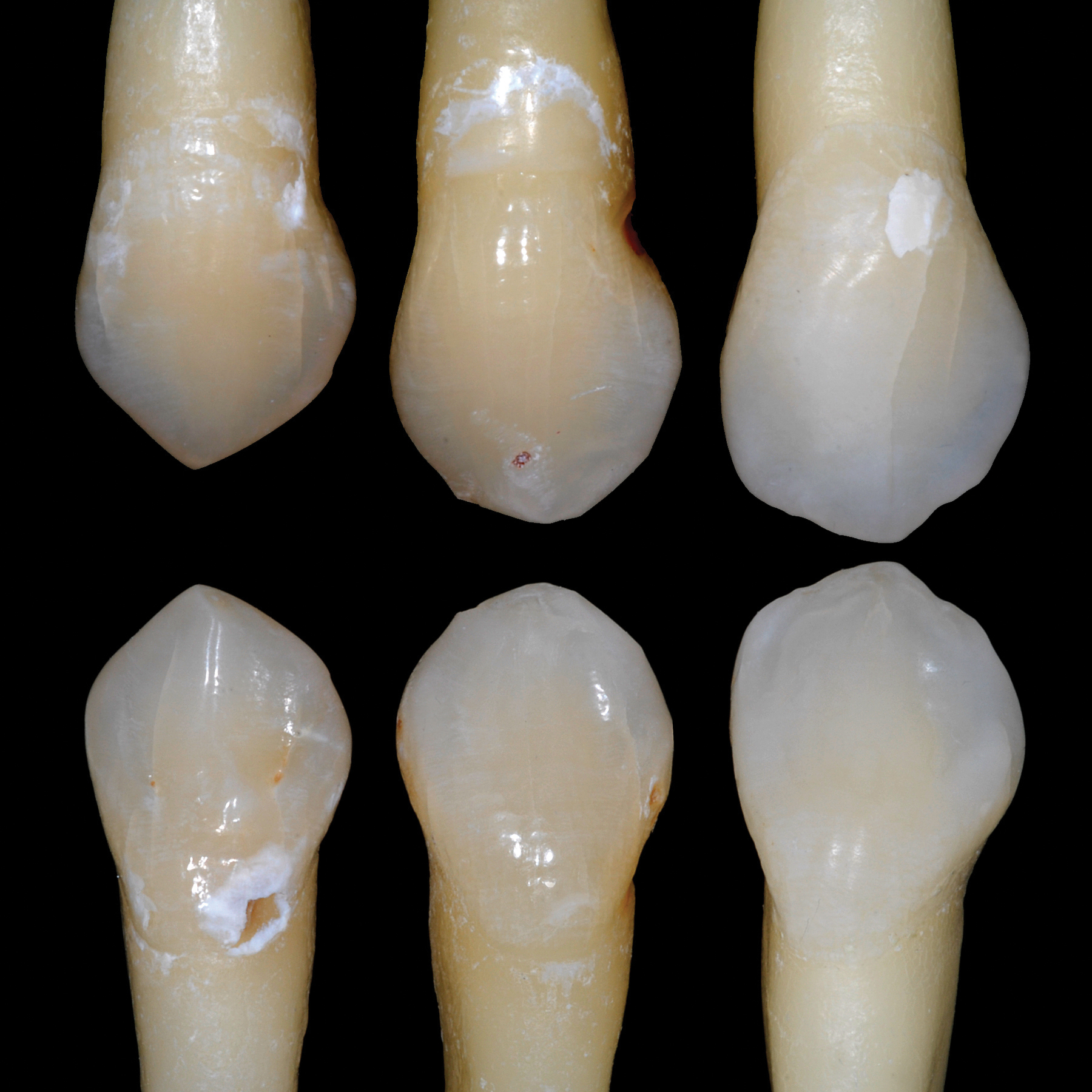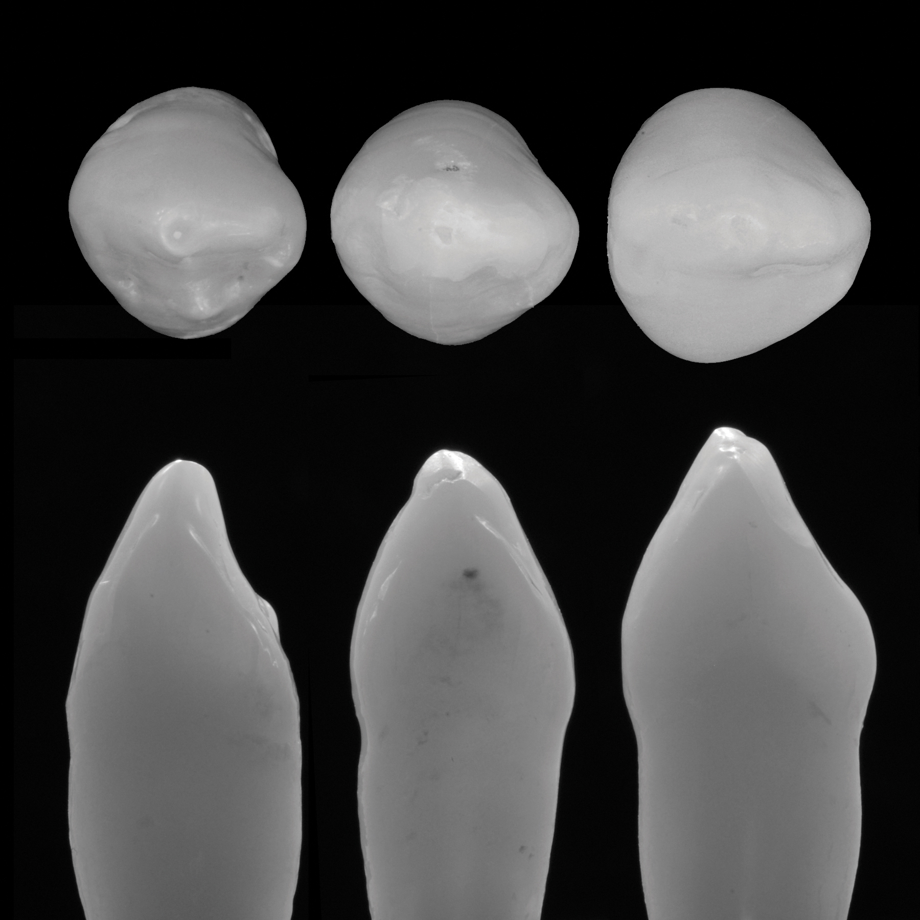 During the process of this study, the author cleaned, photographed, and measured 600 teeth. Mesial distal crown width, labial lingual crown width, crown length, and overall tooth length were measured and recorded to the hundredths with digital calipers. Of the 600 teeth, 192 were photographed from four perspectives: facial, lingual, side, and occlusal. Labial and lingual photographs were taken in color. Labial/lingual photographs are displayed together to show how the lingual aspect can affect the shape of the incisal aspect. The labial/lingual images were made from separate images and combined using Photoshop. Side and occlusal views are displayed in black and white to put the focus on shape. All teeth were photographed with a dual-point source flash in a light box. The labial and lingual images were also photographed using cross-polarization to highlight internal color characteristics. Due to the vast number of photographs, only a select few are included in this article.