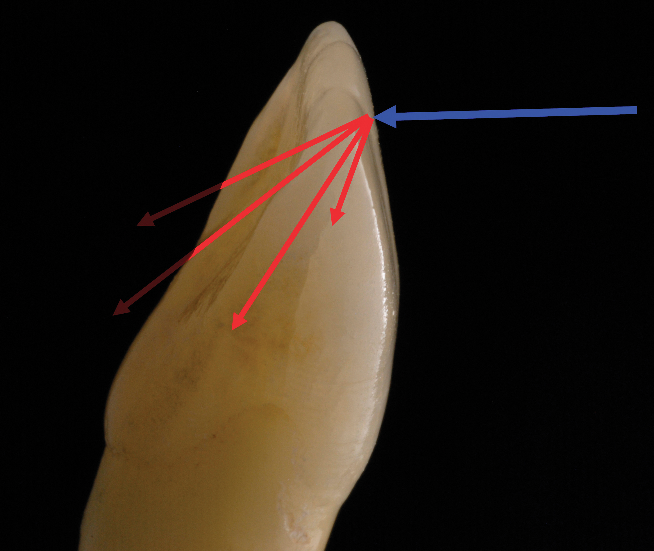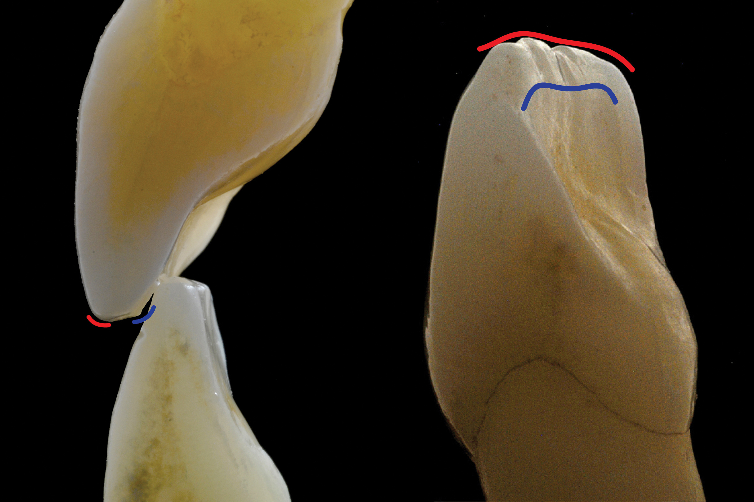 Anterior teeth are part of a complex chewing system, and the shapes of teeth play a role within this system. Often when people consider the shape of anterior teeth they refer to the incisal edge. More accurately, anterior teeth have an incisal ridge.3 This ridge consists of the labial incisal edge (Figure 4, red lines) and the lingual incisal edge (Figure 4, blue lines). These two edges form the boundaries of the incisal ridge. The lingual edge, which is often ignored, is the functional component that is dictated by the mandibular incisors and by how the patient chews. The labial edge is the esthetic incisal edge that is seen when a person speaks or smiles.